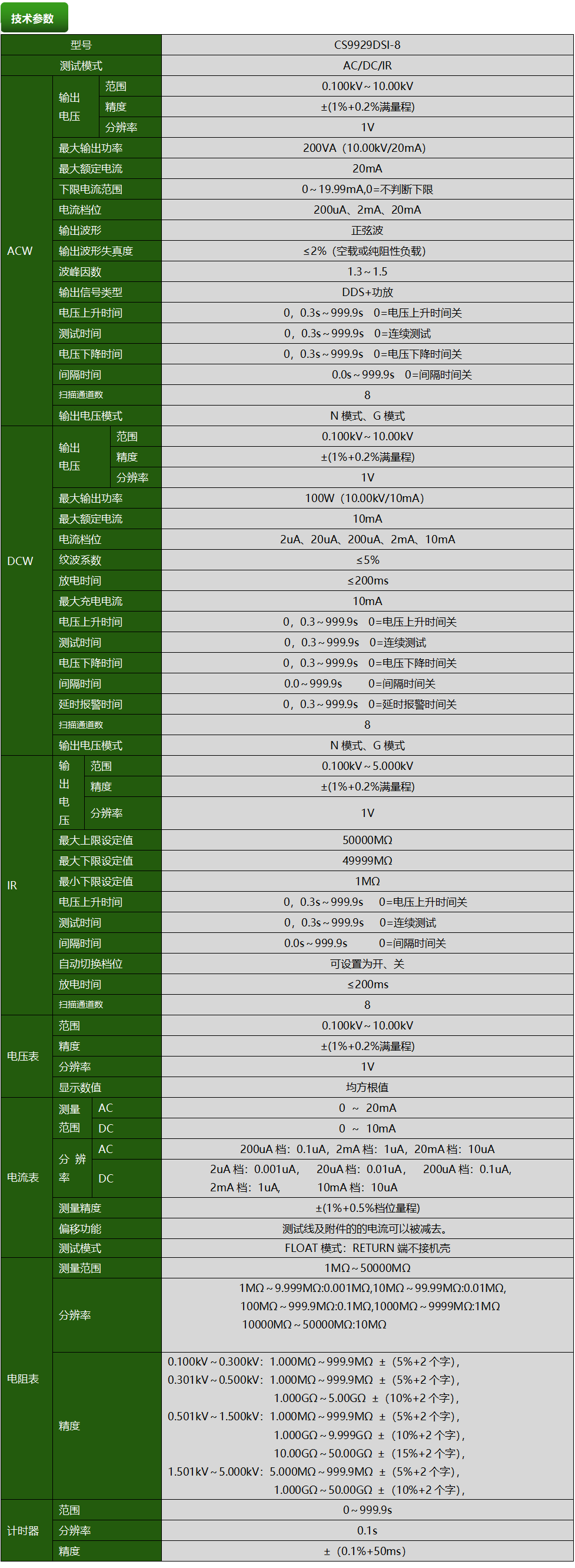 CS9929DSI-8多路绝缘耐压测试仪产品参数