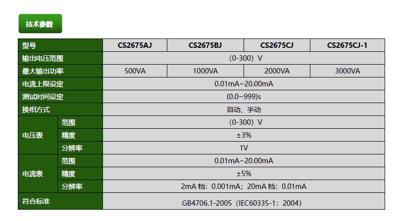 CS2675AJ泄漏电流测试仪,同系列型号:CS2675BJ,CS267CJ,CS2675CJ-1,电压0-300V,功率500W-3000W